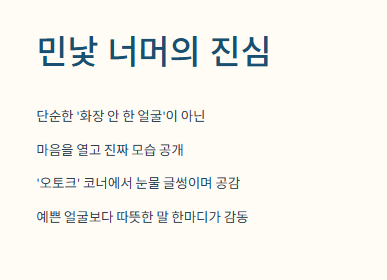 그 순간 진심으로 ‘이 언니 멋있다’고 느꼈음. 솔직히 예쁜 얼굴보다 감정에 공감해주는 그 따뜻한 말 한마디가 더 깊게 와 닿았어.