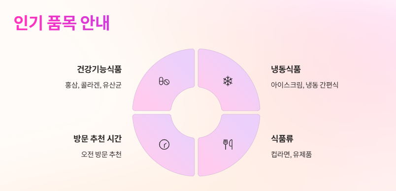 냉동식품, 아이스크림, 컵라면, 유제품 등은 오픈런 수준의 인기를 자랑하기 때문에 오전 방문을 추천드려요!
