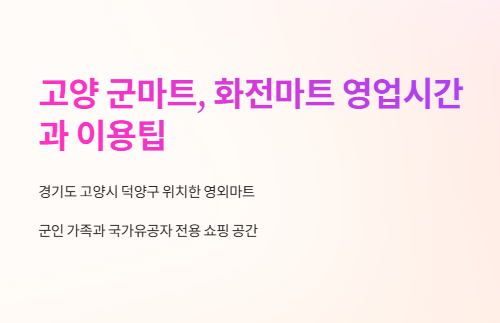 고양 군마트 화전마트는 경기도 고양시 덕양구에 위치한 영외마트로, 군인 가족과 국가유공자 등 자격요건을 갖춘 분들에게만 개방되는 특별한 쇼핑 공간입니다. 이 글에서는 고양 화전마트의 정확한 영업시간, 휴무일, 구매 제한 품목, 방문 시 주의사항 등을 직접 다녀온 경험을 바탕으로 상세히 소개해 드립니다.