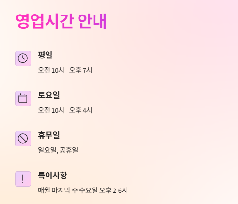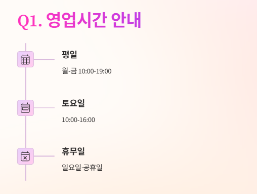 월금 10:00-19:00, 토요일 10:00~16:00, 일요일·공휴일 휴무입니다.