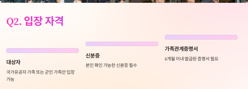 국가유공자 직계 가족 또는 군인 가족의 경우에만 출입이 가능하며, 다음의 준비물이 필요합니다: