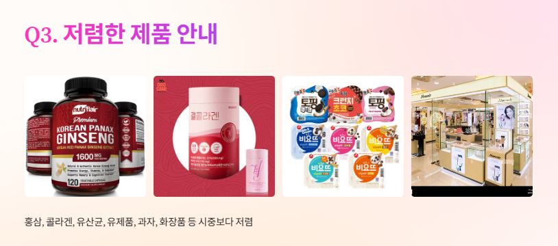홍삼, 콜라겐, 유산균, 유제품, 과자, 화장품 등 고가 생활품이 시중보다 저렴합니다.