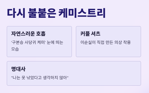 '구본승 사당귀 케미'라는 말이 자연스럽게 떠오를 정도로 두 사람의 호흡은 눈에 띄었다. 특히 이순실이 직접 만든 커플 셔츠를 입은 두 사람의 모습은 보는 이들로 하여금 실제 연인 같은 착각을 불러일으켰다. 김숙이 “나는 못 낚았다고 생각하지 않아. 사람을 낚았다”는 말로 응수한 장면은 이날 방송의 백미였다.
