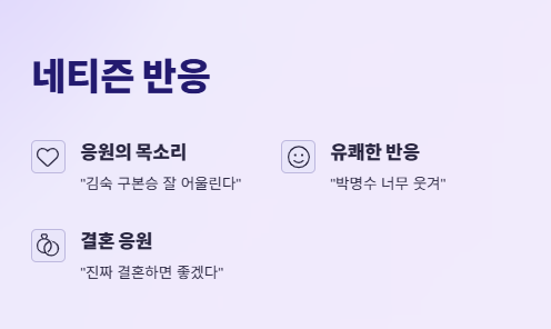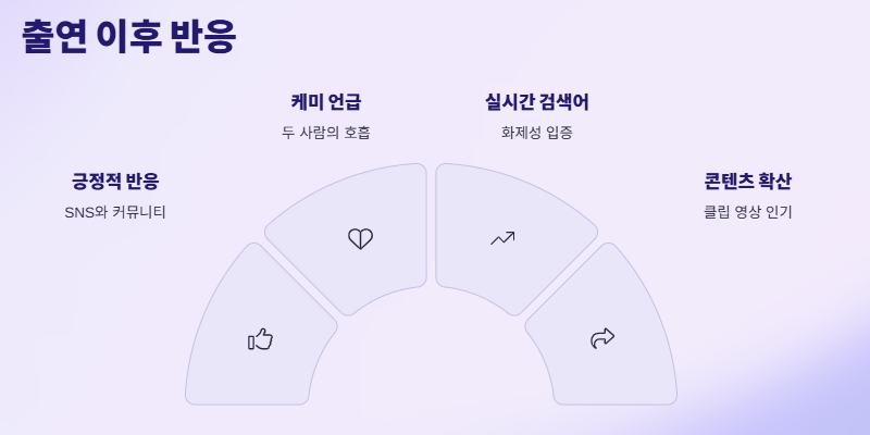 방송 직후 커뮤니티에서는 “김숙 구본승 잘 어울린다”, “이 커플 응원하고 싶다”, “박명수 너무 웃겨”, “진짜 결혼하면 좋겠다” 등 호의적인 반응이 이어졌다. 이렇듯 ‘구본승 사당귀 출연’이라는 키워드는 단순한 방송 출연을 넘어서 화제의 중심이 되었다.