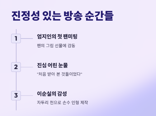 이순실 역시 감성적인 장면을 선사했다. 잃어버린 딸을 떠올리며 자투리 천으로 손수 인형을 만드는 모습은 시청자들에게 뭉클한 감동을 안겼다.