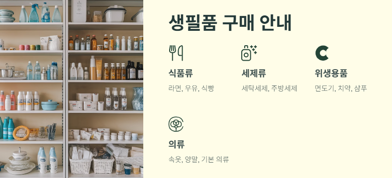 네, 라면, 우유, 식빵, 세제, 면도기 등 다양한 생필품이 구비되어 있어 쇼핑이 가능합니다.