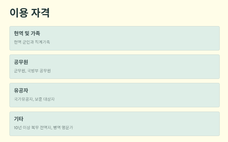 군 관계자 및 그 가족만 이용할 수 있으며, 신분증 및 관계증명서 확인이 필요합니다.