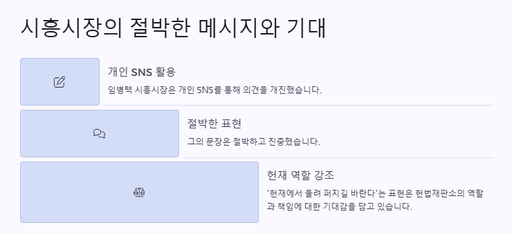 시흥시의 임병택 시장 역시 개인 SNS를 통해 의견을 개진했다. 그의 문장은 절박하고 진중했다. ‘헌재에서 울려 퍼지길 바란다’는 표현은 헌법재판소의 역할과 책임에 대한 기대감을 담고 있다. 이는 단순한 정치적 발언이 아니라, 시민 사회 전체에 향한 메시지로 해석된다.