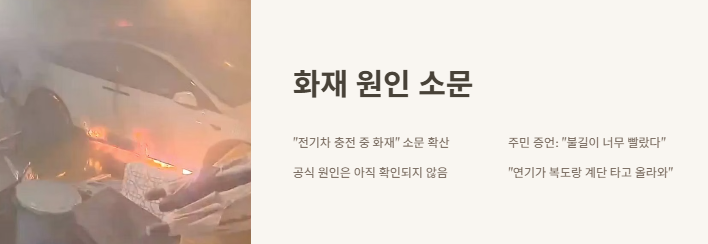 그리고 인터뷰 보면 “전기차에서 연기가 나기 시작했다”는 말도 있었어. 아직은 정확한 원인이 밝혀지지 않았지만, 전기차 배터리 폭발 이슈는 요즘 뉴스에서도 자주 나오잖아. 그래서 더 무섭게 느껴졌어.