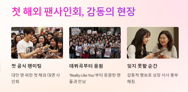 대만 팬들을 위한 첫 공식 팬미팅 성격의 해외 대면 사인회도 개최되었다. 특히 데뷔곡 ‘Really Like You’부터 꾸준히 응원해준 팬들과의 만남은 규빈에게도, 팬들에게도 잊지 못할 순간으로 남게 될 것이다. 이러한 감동적인 행보는 자연스럽게 ‘규빈 대만 시구 나무위키’ 검색으로 이어지며, 그의 성장 서사를 더 풍부하게 만든다.