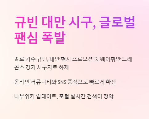 K-POP 솔로 아티스트로서 대만 시장을 정조준한 이번 일정은, 향후 일본, 태국, 인도네시아 등 아시아 전역으로의 진출에 초석이 될 수 있다. 이번 대만 시구 이벤트와 광고 촬영은 단순한 팬 서비스가 아닌 전략적인 시장 진입으로 볼 수 있다. ‘규빈 대만 시구 나무위키’처럼 관련 정보에 대한 수요도 지속적으로 증가할 가능성이 높다.