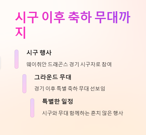단순한 시구에 그치지 않는다. 규빈은 웨이취안 드래곤스 경기 이후 그라운드에서 축하 무대를 선보인다. 이처럼 시구와 축하 무대가 함께 이루어지는 일정은 흔치 않아, 팬들뿐만 아니라 스포츠 팬들의 관심까지 사로잡고 있다. 이 역시 ‘규빈 대만 시구 나무위키’ 키워드로 분산되어 언급되며 정보 열람 수가 급증했다.