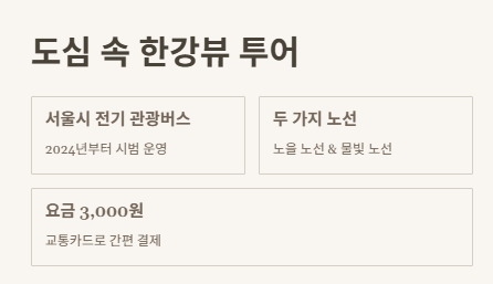 한강버스는 서울시가 2024년부터 시범 운영한 전기 관광버스인데, 단순히 이동만 하는 게 아니라 서울의 유명한 한강공원 포인트들을 연결해서 도심 안에서 미니 여행을 즐길 수 있게 해주는 거야. 게다가 전기버스라서 소음도 적고, 환경에도 좋은 느낌!