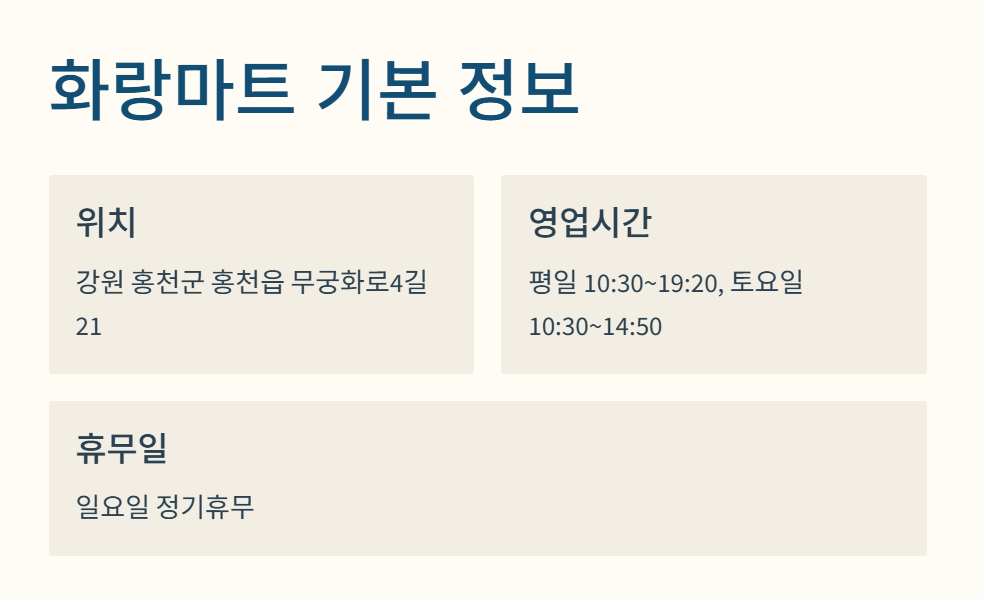 사실 처음에는 홍천 군마트 화랑마트 영업시간이 정확하게 안내된 게 없어서 나도 찾아다니느라 좀 헤맸었거든? 그런데 정리해보면: