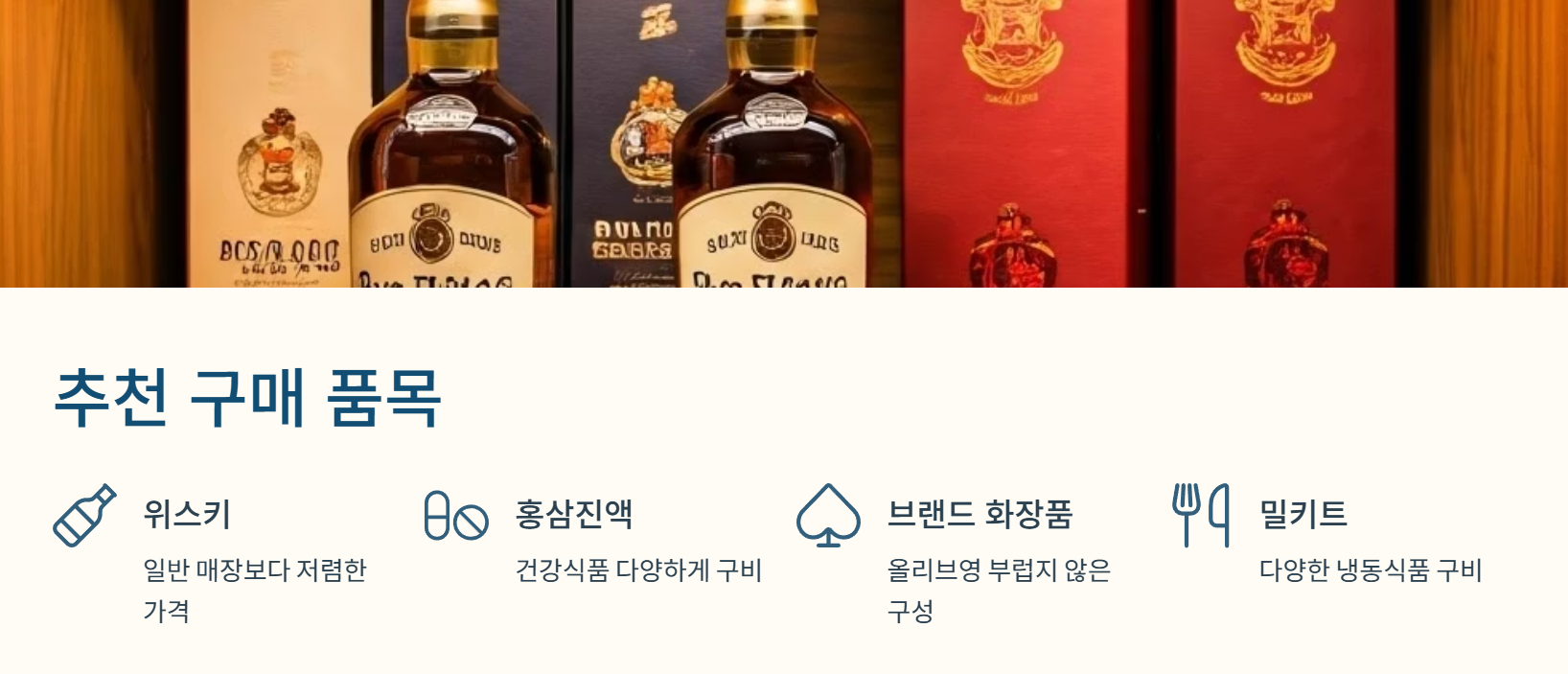 홍삼진액, 콜라겐, 위스키, 브랜드 화장품, 밀키트 등이 대표적입니다.