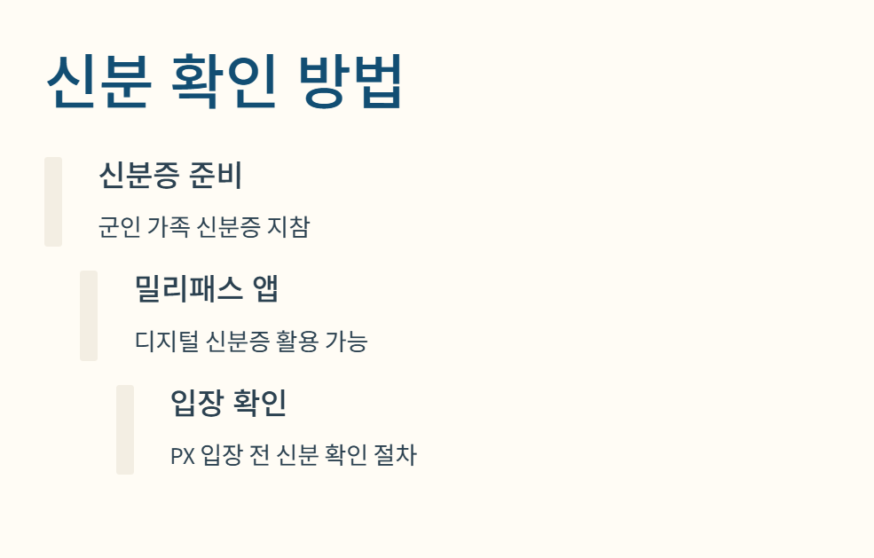 PX 입장 전 군인 가족 신분증 또는 밀리패스 앱을 통해 확인합니다.