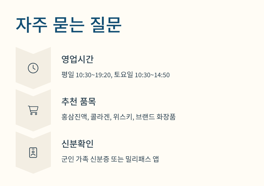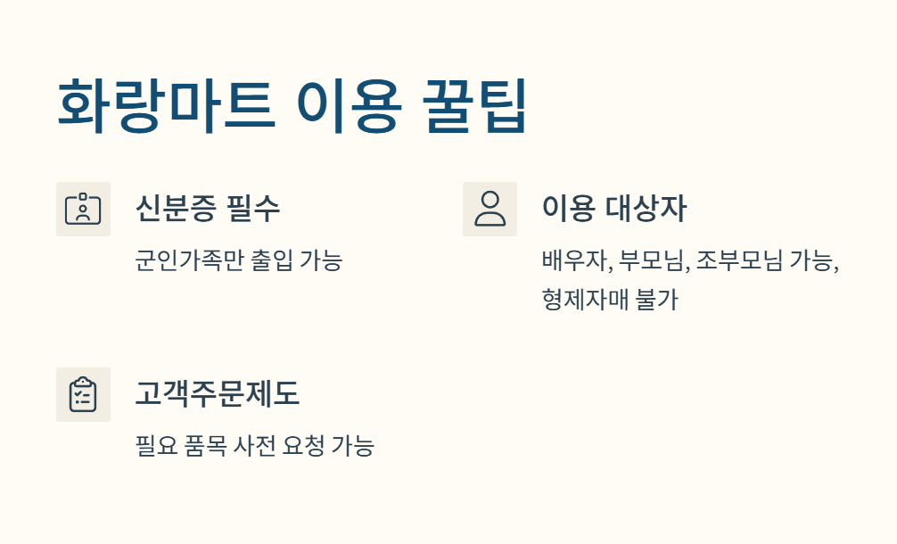 화랑마트는 군인가족만 출입 가능하니까 신분증 꼭 챙겨야 돼. 배우자뿐 아니라 부모님, 조부모님도 이용 가능하지만, 형제자매는 이용 안 된다는 점은 꼭 알아두자! 홍천 군마트 화랑마트 영업시간도 중요하지만, 이 이용 대상자 규정 모르면 헛걸음 할 수 있음ㅠ