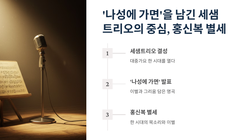 세샘트리오 홍신복 별세는 단순한 뉴스가 아니다. 그의 별세는 대중가요의 한 시대를 함께 했던 목소리의 이별을 뜻한다. ‘나성에 가면’은 당시 해외 이민 붐이라는 사회 분위기 속에서 이별과 그리움을 담은 곡으로 사랑받았다. 그 곡을 부른 목소리는 바로 홍신복이었다. 많은 사람들은 “홍신복 별세”라는 뉴스를 접하며 과거의 기억을 떠올리게 된다.