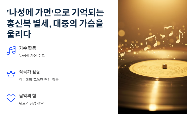 우리의 삶에 영향을 준 예술가가 세상을 떠났을 때, 우리는 자연스레 ‘그의 음악’을 떠올린다. ‘나성에 가면’이 흘러나올 때면, 사람들은 잠시 멈춰 그 멜로디에 젖어든다. 홍신복 별세는 그런 음악적 순간들의 끝이 아니라, 다시 시작되는 지점일지도 모른다.