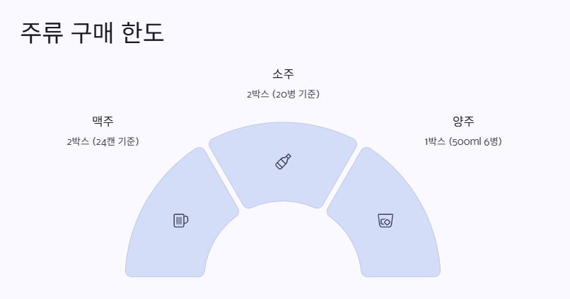 군마트에서 주류는 일정 수량으로 제한되어 있으며, 과도한 음주나 재판매를 방지하기 위한 규정이 있습니다.