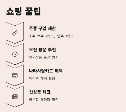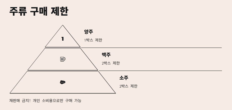 - 주류 구입 제한 있어요! (소주·맥주 2박스씩, 양주 1박스)