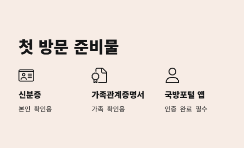 신분증, 가족관계증명서, 국방포털 앱 인증 완료가 필수예요.