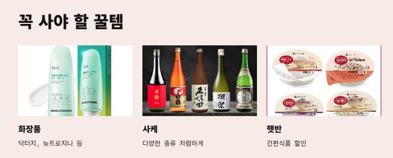 화장품(닥터지, 뉴트로지나), 사케, 햇반, 샴푸류, 영양제 등 다양해요.