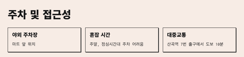 마트 앞에 야외 주차장이 있는데, 주말이나 점심시간대엔 사람 많아서 꽉 찰 수 있어.