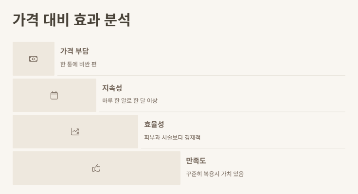 가격대는 좀 부담되긴 했어. 한 통에 만만치 않은 금액이었거든. 그래도 하루 한 알로 한 달 넘게 먹을 수 있으니까, 뭐... 피부과 가서 시술 받는 비용 생각하면 오히려 싸게 먹힌 셈이지. 그리고 무엇보다 꾸준히 복용할수록 피부 컨디션이 전반적으로 좋아지는 게 체감돼서, 나에겐 값어치 있는 소비였어.