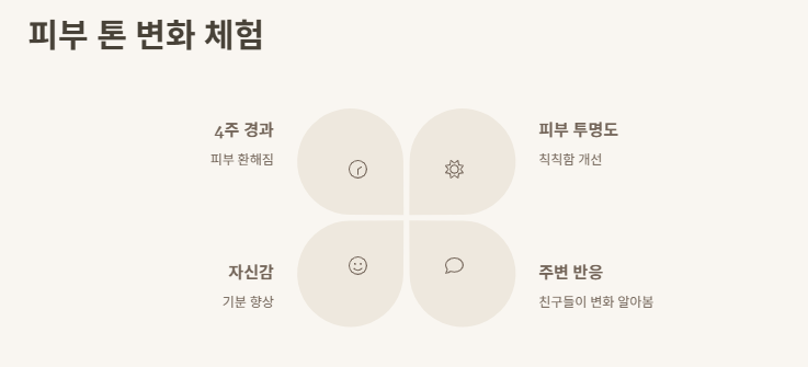 내가 피부가 살짝 노란 톤이라 늘 칙칙해 보였는데, 4주 정도 지나니까 뭔가 환해진 느낌이 들었어. 물론 하얘진다 이런 건 아니고, 그냥 피부가 투명해졌다고 해야 하나? 실제로 친구가 "피부 좋아졌다"는 말도 해줘서 괜히 기분 업됐음.