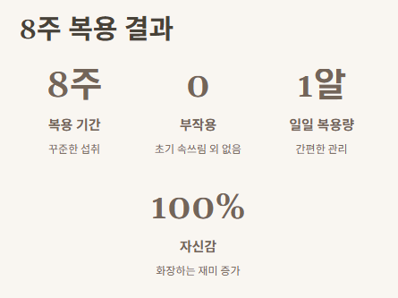 내돈내산으로 사서 복용했는데, 확실히 처음 2주간은 큰 변화가 없었어. 그래도 하루 한 알이면 되니까 루틴으로 만들기 쉬웠고, 3주차쯤부터는 아침에 세안할 때 당김이 덜한 느낌이 있었어. 그 이후로는 피부결도 부드러워지고, 화장도 착붙! 특히 8주 지나고 나선 진짜 모공이 눈에 띄게 작아진 것 같았어.