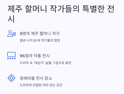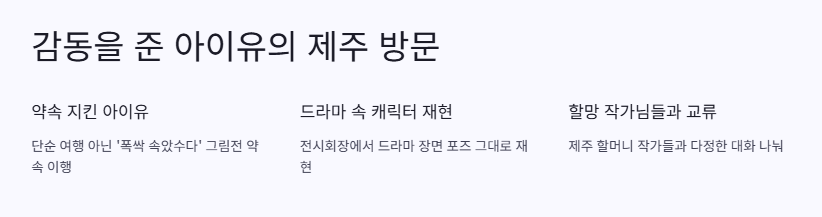 전시회장에서는 드라마 장면을 그린 그림 앞에서 똑같은 포즈로 사진도 찍었고, 제주 할망 작가님들이랑 다정하게 대화 나누는 모습도 있었대. 진짜 약속 지키러 간 거 실화야… 사람 냄새나서 너무 좋았어.