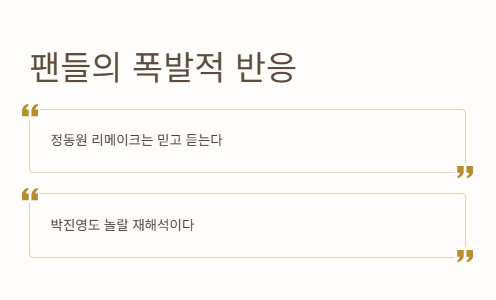 특히 정동원은 이번 촬영 준비하면서 잠도 거의 못 잤다고 하더라고. 그런데도 피곤한 기색 하나 없이, “은은한 콘셉트가 오히려 나한테 맞았다”고 말하는 거 보고 진짜 멋있다고 느꼈어. 연애 경험이 없어서 순수한 남자의 감정을 담았다는 말도 너무 인상 깊었고. 이런 진심이 담긴 리메이크라서 팬들 사이에서도 “이거 진짜 역대급이다”, “정동원 스타일 제대로다”라는 반응이 넘쳐났어. 나도 영상 보면서 몇 번을 소름 돋았는지 몰라.