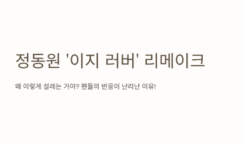 팬들 반응도 진짜 장난 아니었어. 커뮤니티에 올라오는 글마다 “정동원 리메이크는 믿고 듣는다”, “박진영도 놀랄 재해석이다” 같은 댓글이 쏟아졌고, 나도 계속해서 유튜브 쇼츠 영상 돌려봤어. 티저 영상에서 공개된 몇 초만으로도 팬들 심장을 폭격하는 정동원의 매력은 진짜 최고였어. JD1로 활동하는 정동원, 이번 '이지 러버'는 레전드로 남을 거야.