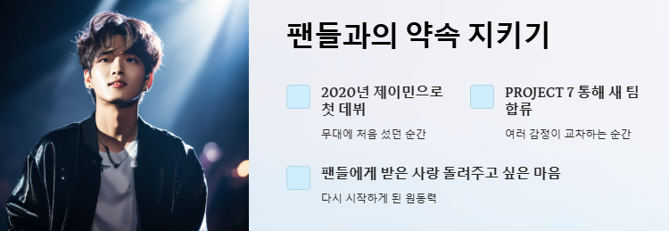 2020년 제이민이라는 이름으로 처음 무대에 섰던 그는 오디션 프로그램 'PROJECT 7'을 통해 새로운 팀에 합류하게 되었다. 여러 감정이 교차하는 순간이었지만 그는 "항상 팬들에게 받은 사랑을 돌려주고 싶었다"는 마음으로 다시 시작했다.