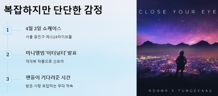 클로즈 유어 아이즈 활동을 중심으로 다양한 무대와 콘텐츠에서 팬들과 소통할 예정입니다.