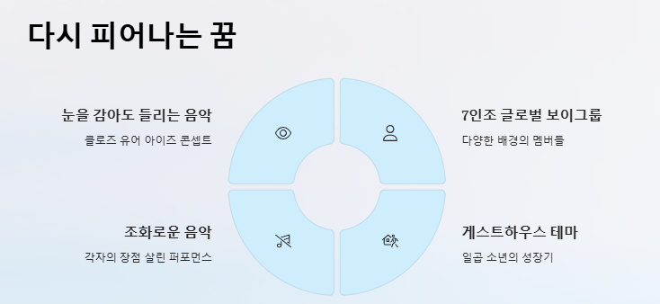 ‘클로즈 유어 아이즈’는 '눈을 감아도 들리는 음악'이라는 콘셉트로 결성된 7인조 글로벌 보이그룹이다. 프로젝트7을 통해 선발된 멤버들은 각자의 배경과 장점을 살려 조화를 이룬다. 이들의 첫 미니앨범은 일곱 명의 소년이 하나의 게스트하우스에서 펼치는 성장기를 테마로 삼았다.