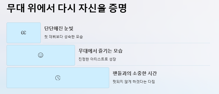 첫 번째 데뷔보다 더 단단해진 눈빛과 다짐이 인상 깊다. “이제는 무대에서 내가 즐기고 있는 모습을 보여드리고 싶다. 팬들과의 시간이 헛되지 않게 하겠다”며 진심을 거듭 강조했다.
