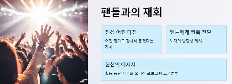 그는 인터뷰에서 팬들에게 끊임없이 고마움을 표현했다. “늘 응원해주신 여러분이 있었기에 다시 이 자리에 설 수 있었다”는 말에서 팬사랑이 얼마나 큰 원동력이었는지를 짐작할 수 있다.
