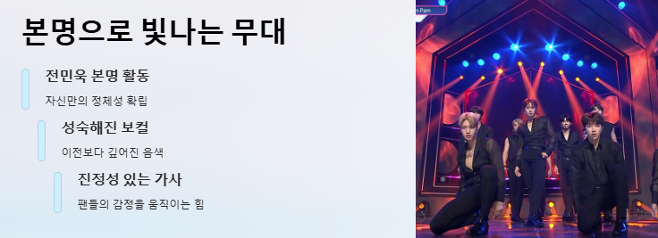 전민욱은 재데뷔 무대에서 “어떤 평가도 감사히 듣고, 팬들에게 행복을 돌려줄 수 있도록 노력하겠다”는 말로 진심을 전했다. 이 발언은 단순한 다짐이 아닌, 지난 활동 중단 시기와 오디션 프로그램에서의 고군분투를 함께했던 팬들에게 전하는 헌신의 메시지였다.