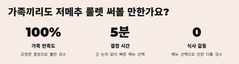 → 가족 회의 전에 룰렛 돌려서 공정하게 결정하면 불만도 줄고 분위기도 좋아져요!