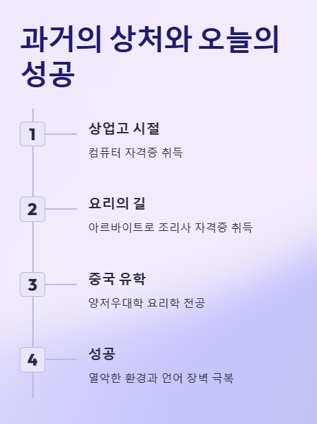 이 질문은 그녀가 방송에서 밝힌 ‘주방 폭행’ 경험으로 대답할 수 있다. 칼국자, 냄비 뚜껑으로 맞으며도 버텨야 했던 과거. 그녀는 남초의 고강도 중식 주방에서 살아남기 위해 누구보다 먼저 출근했고, 실수를 덜기 위해 손기술까지 학원에서 배웠다.