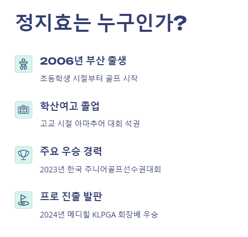 2006년 부산에서 태어난 정지효는 초등학생 시절부터 골프를 시작했습니다. 학산여고를 졸업한 그녀는 고교 시절 다양한 아마추어 대회를 휩쓸며 국가대표 상비군으로도 활동했죠. 특히 2023년 블루원배 제40회 한국 주니어골프선수권대회에서 우승하며 전국구 유망주로 떠올랐고, 2024년 메디힐 KLPGA 회장배에서도 정상에 오르며 프로 진출의 발판을 마련했습니다.
