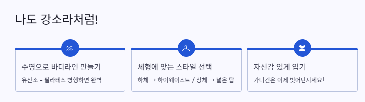 또 하나! 수영복 고를 때 체형에 따라 다르게 입는 게 중요한데, 나처럼 하체가 있는 사람은 하이웨이스트 스타일 추천하고, 상체에 살 있는 친구들은 비키니보다는 탑이 넓은 디자인이 더 예뻐보이더라. 강소라는 다양한 스타일을 다 잘 소화해서 참고하기 진짜 좋아.