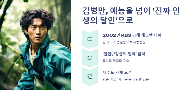 김병만은 2002년 KBS 공채 개그맨으로 데뷔한 이후, '달인', '정글의 법칙' 등을 통해 몸 개그와 특유의 성실함으로 대중의 사랑을 받아왔다. 그는 몸을 아끼지 않는 도전과 도구 없이도 감동을 주는 리더십으로 예능계에서 독보적인 캐릭터를 구축한 인물이다.