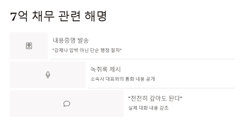 김수현 측은 7억 원 채무 내용증명 발송과 관련하여 “강제나 압박이 아닌 단순 행정 절차였다”고 해명했다. 관련 녹취록까지 제시하며, 고인의 마지막 소속사 대표와의 통화에서 “천천히 갚아도 된다”는 말이 있었다는 점을 강조했다. 김수현 기자회견 핵심은 바로 이 ‘사실 왜곡’에 대한 정정이었다.