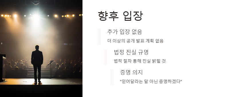 추가 입장 발표는 없을 것이며, 법정에서 진실을 밝히겠다는 의지를 표명했습니다.