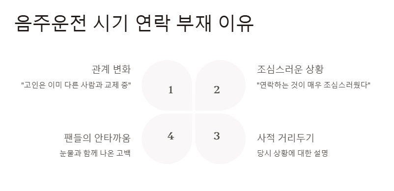 김수현 기자회견에서는 고인이 음주운전 사고를 일으켰을 당시, 왜 연락하지 않았는지도 설명되었다. “고인은 이미 다른 사람과 교제 중이었다. 연락하는 것이 매우 조심스러웠다”고 말하며, 사적인 거리 두기가 필요했던 당시의 상황을 덧붙였다. 김수현 기자회견 눈물과 함께 나온 이 고백은 팬들에게는 안타까움을 안겨주었다.