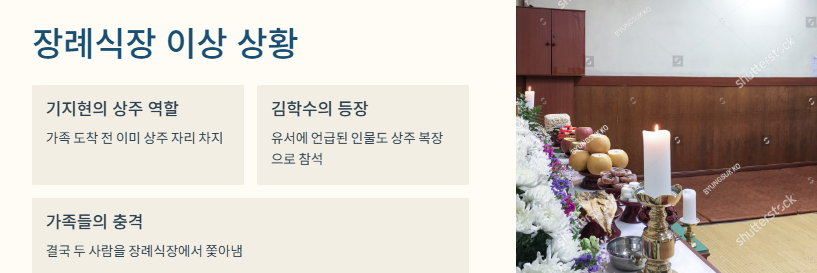 특히 장례식장에서는 기지현이 상주 역할을 맡고 있었고, 심지어 김학수까지 등장해서 가족들과 큰 충돌이 있었대요.
