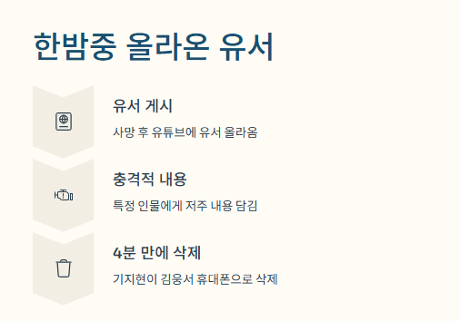 김웅서 기지현 사건에서 가장 충격적이었던 건, 김웅서가 사망한 후 그날 밤, 그의 유튜브 채널에 유서처럼 보이는 글이 올라왔다는 거예요.